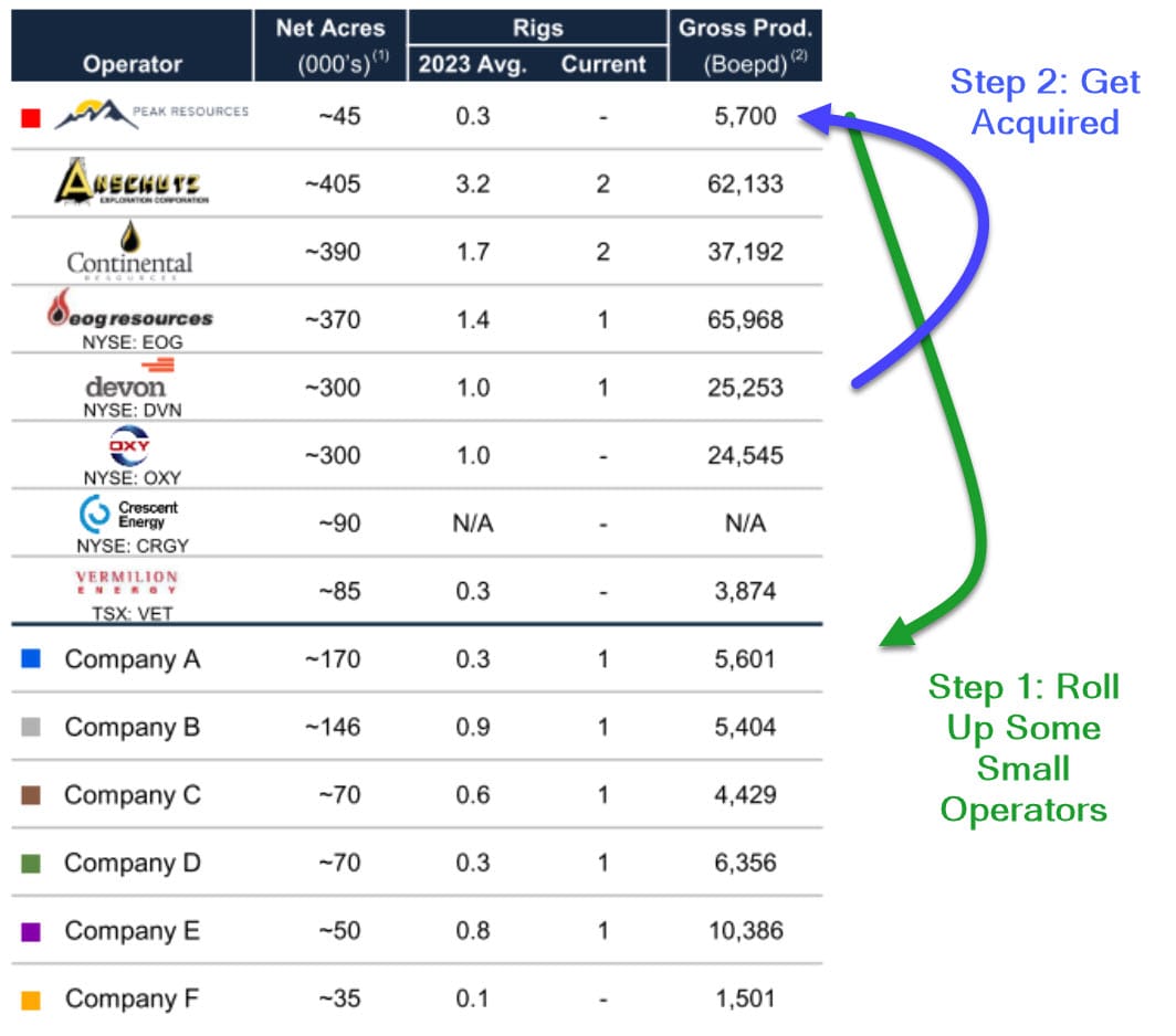 There's a longer-term play for Peak as a small put public fish in this PRB pond. If they grow and also acquire some smaller operators, they will reach a scale that would be more attractive to the large operators - Devon $DVN, Oxy $OXY and EOG Resources $EOG are orders of magnitude larger that want to keep growing in the region.