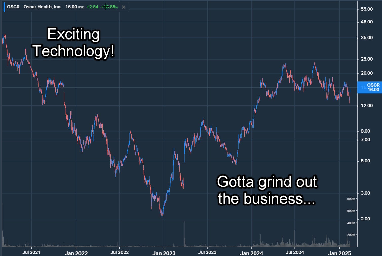 Oscar's founders were brilliant technologists who knew nothing about health insurance. The stock reached $35 on the potential to "revolutionize" the industry and reached $2 on the realization that it wouldn't be easy.