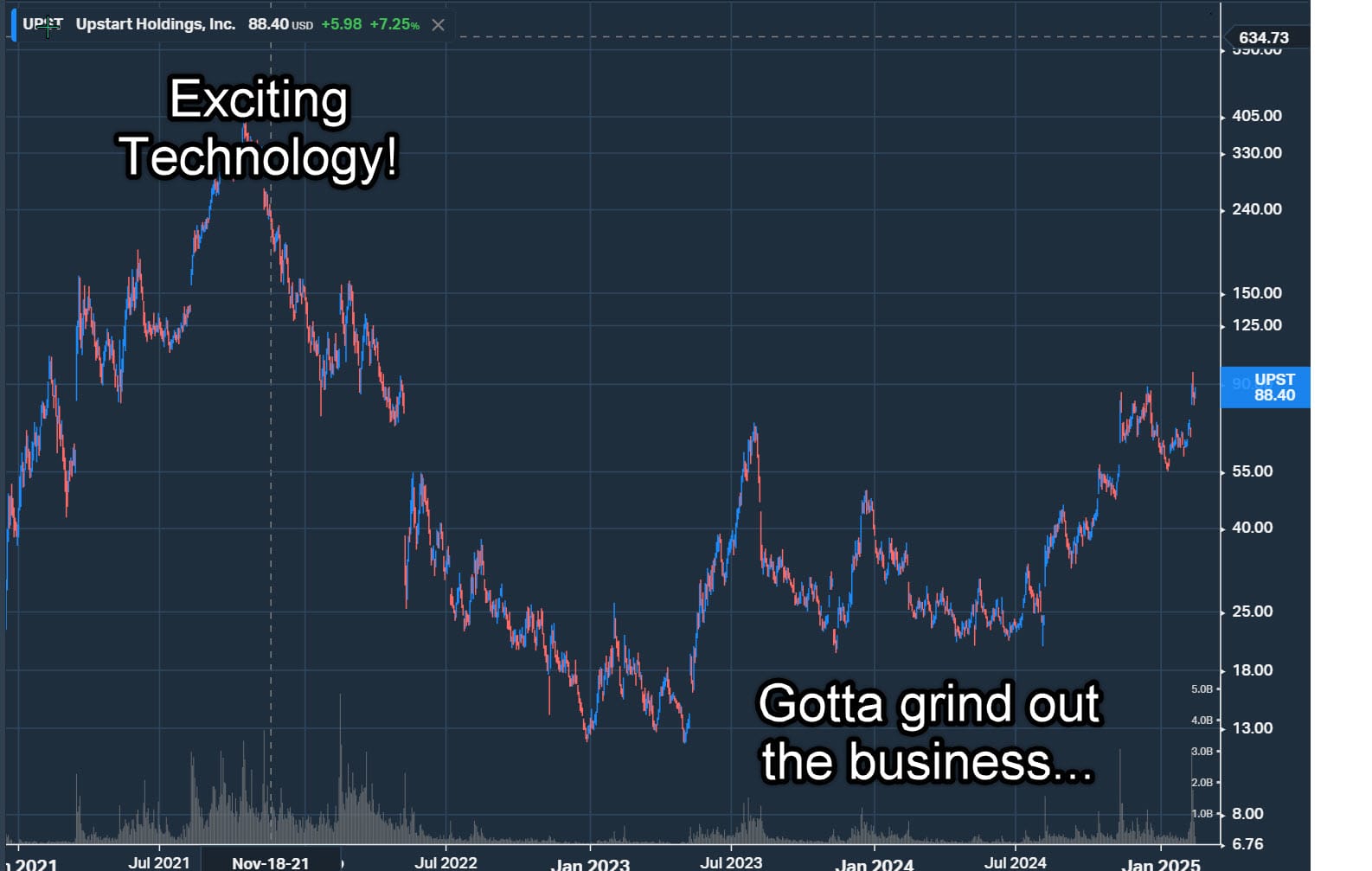 Upstart had a similar path in the bank lending space. Upstart peaked at an astounding $400 before bottoming at $13 and rebounding to $88. This is what can happen when a stock transitions from "technology leadership with business aspirations" to an actual business.