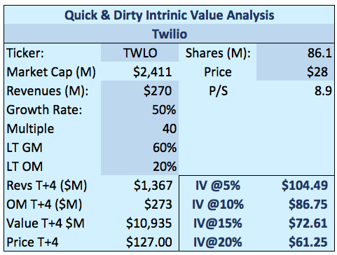 We've updated our "Quick IV model" to account for additional shares and higher current revenue and put a 40x earnings multiple on it. That gives us a $72 target. Investors are encouraged to read the original TWLO prospectus, view the Twilio IPO slide deck, and read our full transcript of the IPO roadshow.