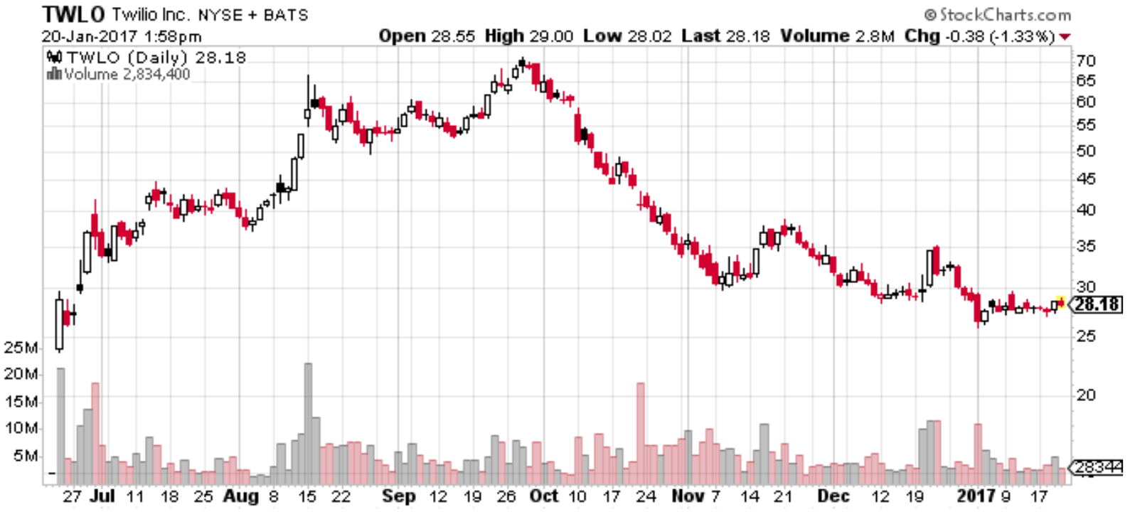 Twilio (NYSE: TWLO) came public in June 2016, and the shares soared over the next three months to touch $70. Three months later, the stock is back in the $20's. The decline can be blamed on the usual suspects - the half-life of IPO hype and the expiration of share lockups which adds supply to the market. A big chunk of shares came off lockup on December 20th, then a small one in early January. Finally, the last large chunk will come in February. (Because the company did a secondary, the pending lockup expiration is staggered.)