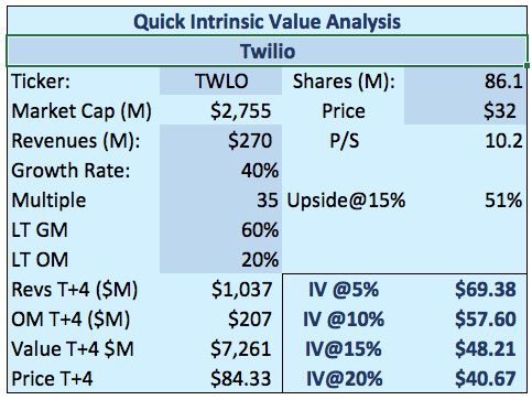 [UPDATE: May 4, 2017] Twilio is losing a chunk of business from Uber, their largest single customer. It's a blow and it will impact the next few quarters. The shares took a big hit which is to be expected. At this point, however, the investment thesis remains intact, and the company continues to add new customers and grow existing ones rapidly. We'll have more to say on it but we do think that we should revise our IV model to factor in the potentially slower growth and a lower multiple. This takes the IV target down materially but it remains attractive at $48/share.